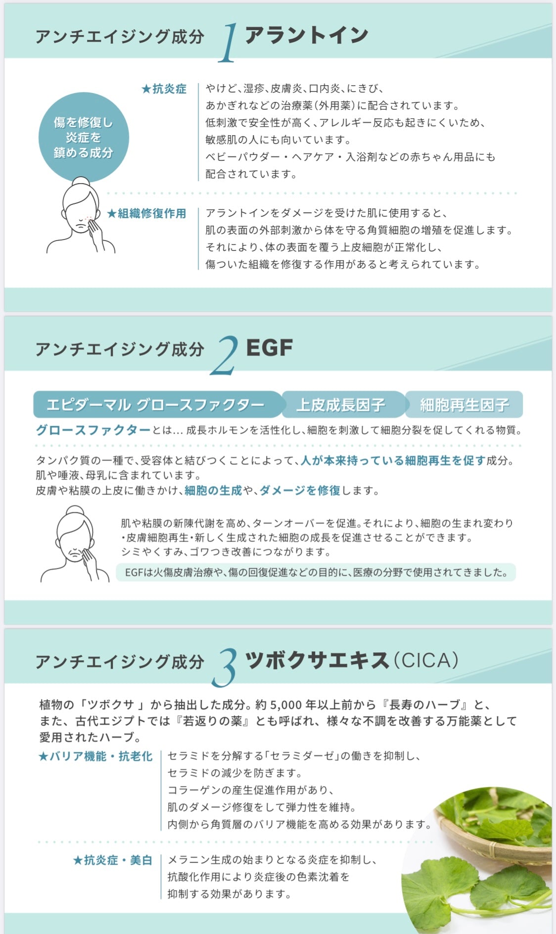 さらに、植物の「ツボクサ」から抽出したツボクサエキスは約5,000年以上前から『長寿のハーブ』や『若返りの薬』と呼ばれ、様々な不調を改善する万能薬として愛用されたハーブ。メラニン生成の始まりとなる炎症を抑制し、抗酸化作用により炎症後の色素沈着を抑制し美白効果も期待できます。
